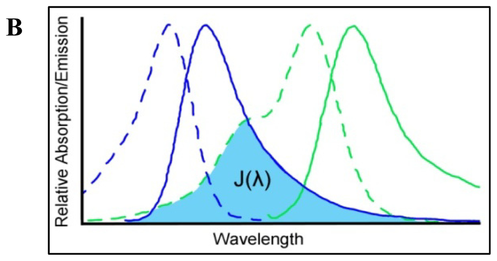 where Ro represents the distance between the fluorophores at which 50% energy transfer occurs. K2 is a dipole orientation factor which describes the relative orientation of the emission dipole of the donor fluorophore and the absorption dipole of the acceptor fluorophore. Since K2 is difficult to measure for fluorophores in solution, it is often approximated to be 2/3 for a freely rotating FRET pair. QYD is the fluorescence quantum yield of the donor in the absence of an acceptor and J(ë) represents the integral of the spectral overlap between the donor emission and the acceptor absorption (Figure 2B). The determined Ro value can then be related to the energy transfer efficiency in the system by: