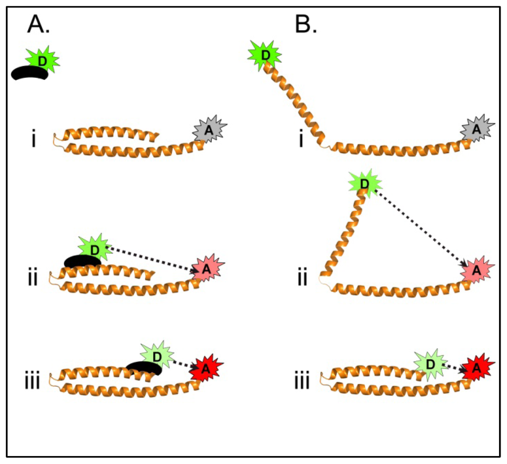 Schematic of hypothetical FRET systems probing intermolecular (A) and intramolecular (B) energy transfer. (A) In this intermolecular example, an acceptor fluorophore is bound to a protein of interest and a donor fluorophore is attached to a ligand which could represent a small molecule, peptide, or another protein. When unbound (Ai), the ligand-associated donor is separated by too much distance to allow efficient energy transfer to occur. Upon binding of the ligand to the protein, the binding event can be monitored by an increase in energy transfer efficiency (seen by the dashed line in Aii and Aiii). Depending on the complexity of the protein structure, the measured energy transfer efficiencies and calculated distances between the probes can be used to help identify the relative location of the ligand binding site (Aii and Aiii). (B) Measurement of intramolecular FRET can be used to gain insight into protein conformations and conformational changes following a specific event such as a molecular interaction. In this example, a protein conformational change results in the intramolecular FRET pair moving from a distance too great for energy transfer to be reliably observed (Bi), to an intermediate distance with detectable, but minimal, energy transfer (Bii), to a final conformation resulting in the two probes being within close proximity to each other and which gives rise to a maximal observed energy transfer efficiency (Biii).