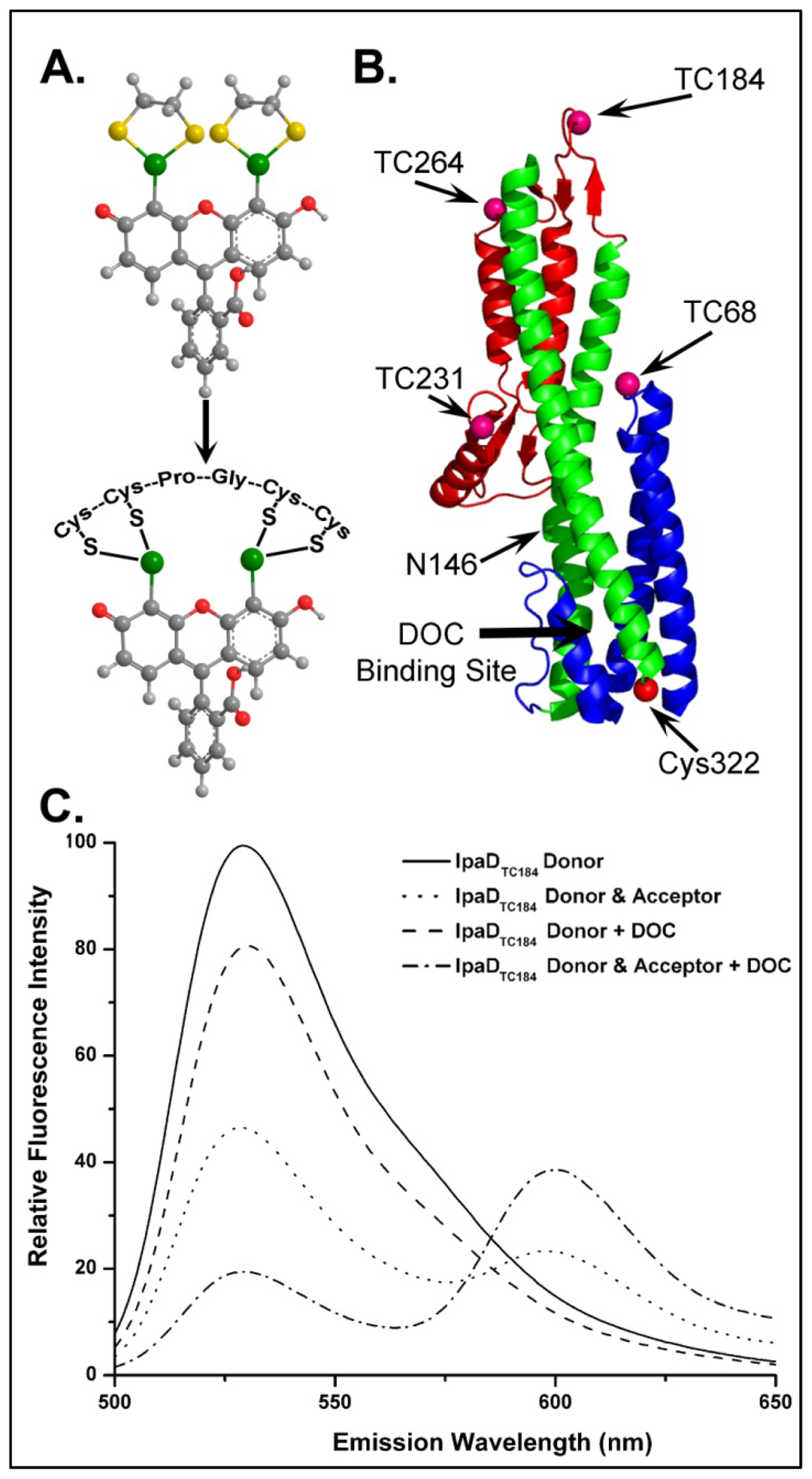 Location of tetracysteine (TC) FlAsH binding sites engineered into IpaD and the fluorescence emission spectra used to quantify FRET from FlAsH on TC184 to Alexa 568 on Cys322. FlAsH is a fluorescein-based fluorophore that specifically coordinates to the TC sequence Cys-Cys-Pro-Gly-Cys-Cys, resulting in a dramatic increase in quantum yield [51] (A). The residues at which TC pockets were introduced into IpaD are indicated on the ribbon structure (B). Panel C shows the representative fluorescence spectra used to determine the effect of DOC on energy transfer efficiencies between FlAsH and the acceptor (Alexa 568) at the native Cys in the IpaD TC184 mutant. As described in the text, energy transfer efficiencies were quantified by measuring the change in donor fluorescence emission intensity in the presence and absence of an acceptor. The spectra in panel C not only show that the donor emission is decreased in the presence of the FRET acceptor, but that the extent of the change is dependent on DOC, allowing a systematic measure of the effect of DOC binding on IpaD structure. The key for identification of each spectrum is given in the inset. Figure adapted from [4].