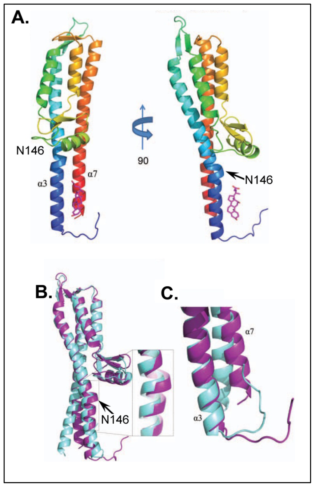 Panel A shows the 1.90 Å-resolution co-crystal structure of DOC bound to IpaD122–319 from Shigella flexneri. The right side is a 90° rotational view of the solved structure with IpaD in cartoon ribbon format and DOC located near the bottom of the molecule in the cleft of helices á-3 and á-7. Panel B and C show the superimposition of free IpaD15–332 (aquamarine) and DOC-bound IpaD122–319 (purple) structures (DOC removed for clarity) identifying several regions of IpaD affected by DOC binding, including the accentuation of the “kink” in helix á-3 (B) and the apparent torsion of the C-terminal region of helix á-7 (C) [46] both consistent with the conformational changes predicted by the previous FRET measurements [4]. Figure adapted from [46].