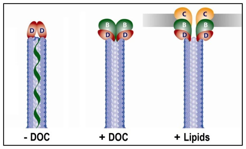 Scanning transmission electron microscopy (STEM) analysis subsequently provided the first evidence of a stable structure at the tip of a T3SA needle with LcrV from Y. enterocolitica atop isolated needles [32]. Shortly after, it was shown that IpaD also forms a tip complex for the S. flexneri T3SA when the organism is grown to early log phase in trypticase soy broth (TSB) [31]. With no other proteins detected as part of the Yersinia or Shigella tip complexes in these pioneering studies and its position as the outermost point of the T3SA, it was proposed that the identified needle tip complex is directly involved in sensing environmental signals and therefore has a role in controlling the secretion status of the T3SS. There is currently much more direct evidence regarding IpaD as a regulatory component of type III secretion than there is for LcrV, perhaps due to the existence of more stringent control of secretion steps in the well-characterized Yersinia system [45]. These initial findings fueled a series of studies directed toward understanding the specific role(s) of IpaD as a T3SA tip complex protein, resulting in strong evidence for an IpaD role in sensing environmental signals. Specifically, these hypotheses stem from recent findings that it specifically binds bile salts to stimulate the recruitment of IpaB to the Shigella T3SA needle tip where it forms a stable structure because of its ability to associate with IpaD [5], which is driven at least in part by significant conformational changes in the structure of IpaD following DOC binding [4,46]. Unfortunately, it is still unclear how this action of IpaD specifically relates to that of other T3SA needle tip complex proteins, however, this may change with the ever growing use of novel techniques and as interest in the action of IpaD homologues increases.