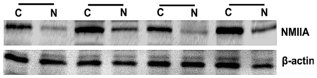 Overexpression of NMIIA in GC as detected by Western blot analysis. Data presented here is a representative of all the samples. β-actin was used as a loading control. N indicates normal tissue; C, patient-matched tumor tissue.