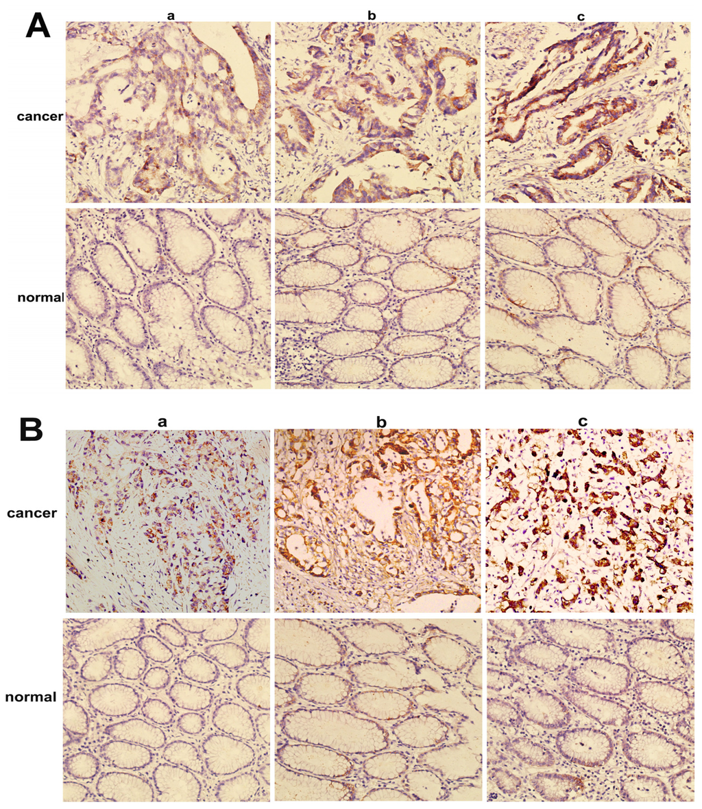 Immunohistochemical analysis of NMIIA expression in gastric carcinoma and adjacent normal gastric epithelium (200×). (A) Intestinal type gastric carcinoma; (B) Diffuse type gastric carcinoma. (a) Weak staining detected in tumor cells; (b) Moderate staining observed in tumor cells; (c) Strong staining detected in tumor cells.