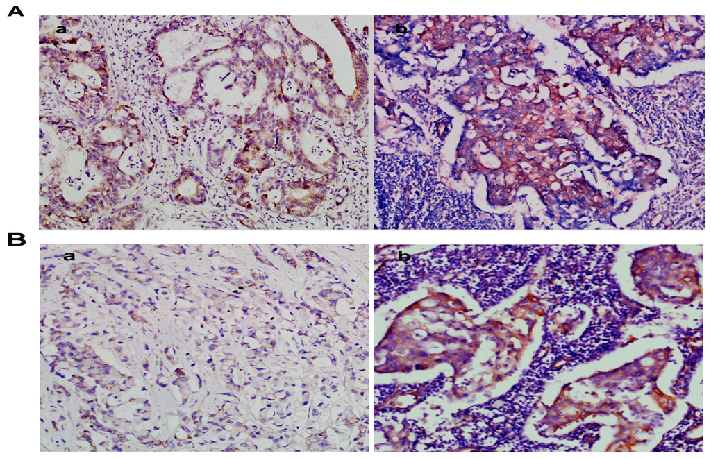 A gastric carcinoma sample shows weak NMIIA expression (a); but its metastatic lymph node has strong NMIIA expression (b) (200×). (A) Intestinal type gastric carcinoma; (B) Diffuse type gastric carcinoma.