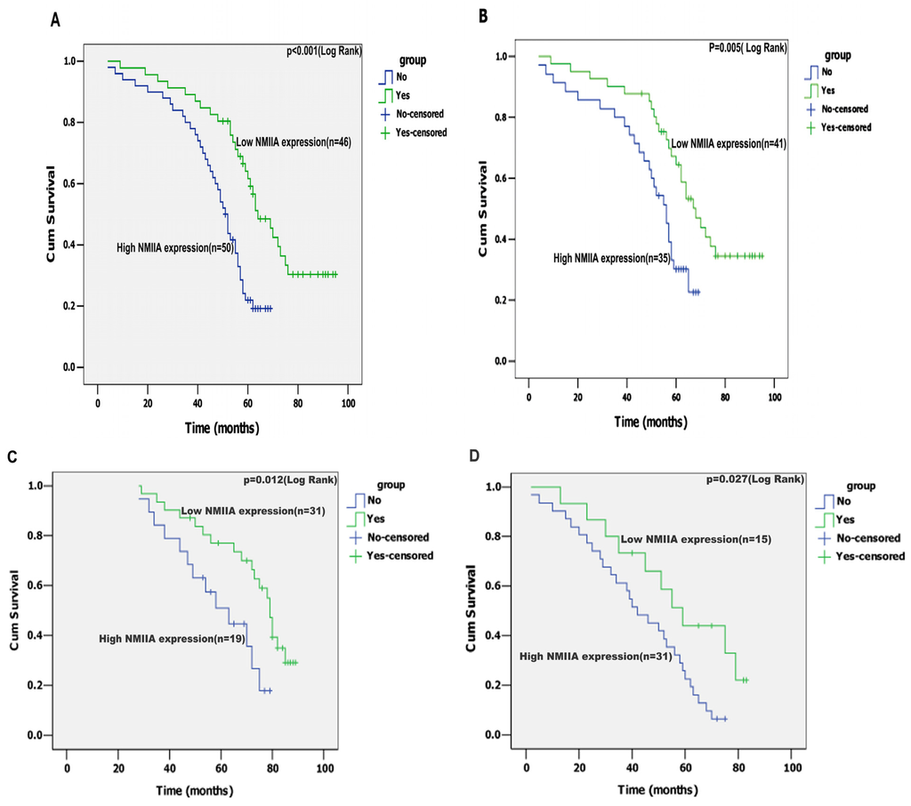 In univariate analysis, depth of wall invasion, lymph node metastasis, distant metastasis, TNM stage and NMIIA expression were associated with overall survival. A Kaplan-Meier analysis and the log-rank test showed that the survival time between the low and high level of NMIIA expression groups was significantly different (n = 96; p < 0.001, Figure 5A). Even in the curative resection cases, The difference in survival time was also significant (n = 76; p = 0.005, Figure 5B). Furthermore, the patients with tumors exhibiting high NMIIA expression had a significantly shorter overall survival time than those with low expression of NMIIA in either the TNM stage I + II subgroup (n = 50; p = 0.012; Figure 5C), or the TNM stage III + IV subgroup (n = 46; p = 0.027; Figure 5D). However, no significant correlation was detected between high NMIIA expression and shorter overall survival time within GCs of Lauren classification tested (intestinal type, or diffuse type), respectively (intestinal type, p = 0.071, n = 53, Figure 5E; diffuse type, p = 0.112, n =43, Figure 5F). These data suggest up-regulated NMIIA expression correlates with poor prognosis.