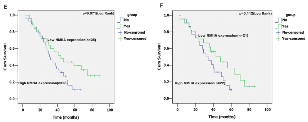 (A) The mean overall survival time for the high NMIIA expression group was 48.5 months, and for the low NMIIA expression group was 67.6 months (p < 0.001); (B) In R0 (radical operation) gastric cancer, the mean overall survival time for the high NMIIA expression group was 51.7 months and for the low NMIIA expression group was 69.8 months (p = 0.005); Statistical significance of the difference between curves of NMIIA high-expressing and low-expressing patients was compared within subgroups of TNM stage I + II (p = 0.012; C) and III + IV (p = 0.027; (D). No statistical significance of the difference between curves of NMIIA high-expressing and low-expressing patients was compared within subgroups of intestinal type gastric carcinoma (p = 0.071; E) and diffuse type gastric carcinoma (p = 0.112; F).
