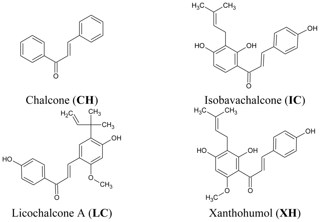 Chalcones (1,3-diphenyl-2-propen-1-ones) represent an important group of the polyphenolic family widespread in various spices, fruits, vegetables, tea or beer [17–19]. Isobavachalcone is found in various medicinal plants, such as Psoralea corylifolia, Angelica keiskei and Broussonetia papyrifera. Licochalcone A is isolated from root of herb named licorice (Glycyrrhiza glabra, Glycyrrhiza uralensis). Xanthohumol is identified in hops (Humulus lupulus), an essential raw material for beer brewing [20–25]. Chemically, they are open-chain flavonoids bearing two aromatic rings joined by a three-carbon α,β-unsaturated carbonyl system [25–29].