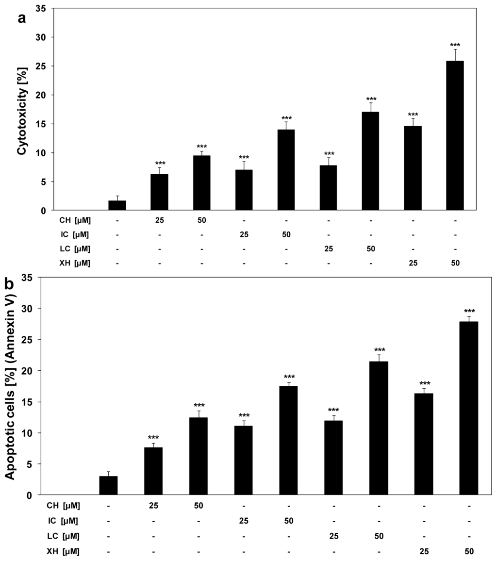 We tested anticancer activity of chalcones at the concentrations of 25 μM and 50 μM against HeLa cells. The compounds induce cytotoxic and apoptotic effects in a dose-dependent manner. The cytotoxicity of chalcones in HeLa cells was: 6.3% ± 1.2%–9.4% ± 0.9% cell death for chalcone, 7.0% ± 1.4%–13.9% ± 1.4% cell death for isobavachalcone, 7.8% ± 1.4%–17.4% ± 1.7% cell death for licochalcone A, 14.5% ± 1.4%–25.8% ± 2.1% cell death for xanthohumol (Figure 2A).