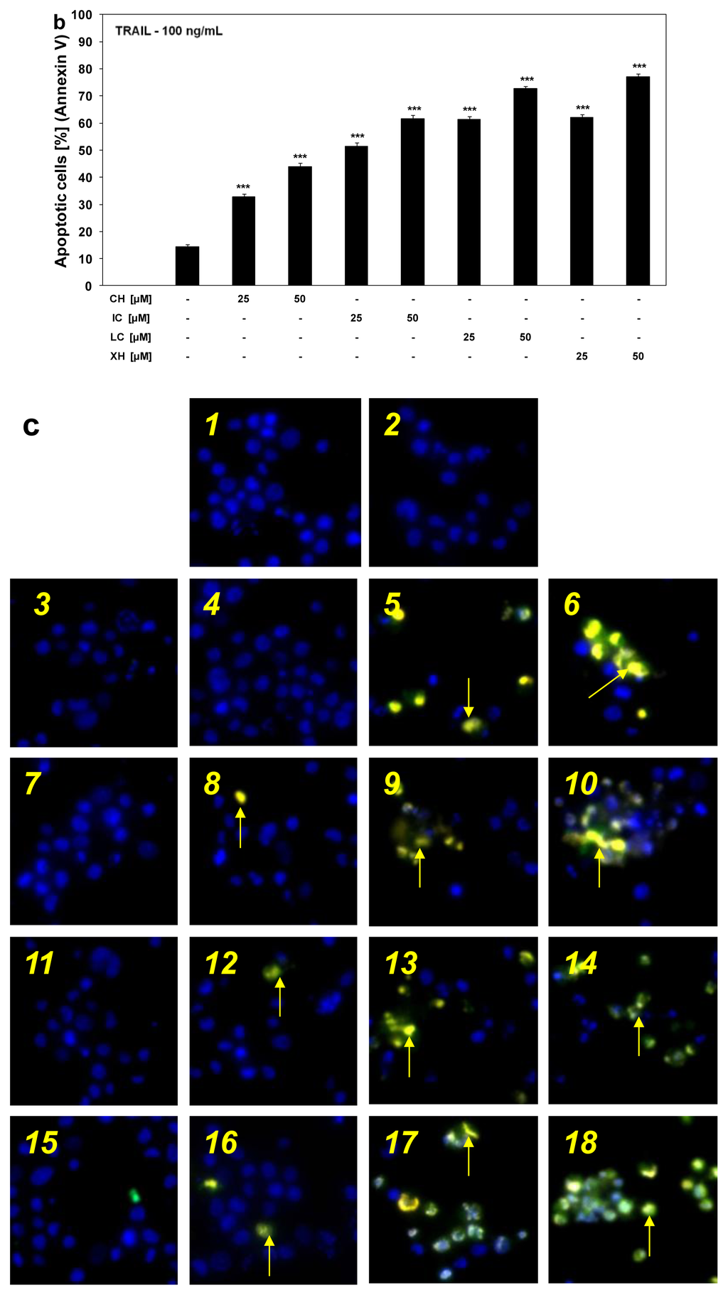 Cytotoxic and apoptotic effects of tumor necrosis factor-related apoptosis-inducing ligand (TRAIL) in combination with chalcones in HeLa cancer cells. The cells were incubated for 24 h with TRAIL at the concentration of 100 ng/mL and chalcones at the concentrations of 25 μM and 50 μM. The values represent mean ± SD of three independent experiments performed in quadruplicate (*** p < 0.001 compared with TRAIL). (a) Co-treatment of TRAIL with chalcones induced cytotoxicity in HeLa cells. The percentage of cell death was measured by MTT cytotoxicity assay; (b) Co-treatment of TRAIL with chalcones induced apoptosis in HeLa cells. Detection of apoptotic cell death by annexin V-FITC and propidium iodide staining using flow cytometry; (c) Co-treatment of TRAIL with chalcones induced apoptosis in HeLa cells: (1) control cells; (2) cells incubated with 100 ng/mL TRAIL; (3) cells incubated with 25 μM chalcone; (4) cells incubated with 50 μM chalcone; (5) cells incubated with 100 ng/mL TRAIL and 25 μM chalcone; (6) cells incubated with 100 ng/mL TRAIL and 50 μM chalcone; (7) cells incubated with 25 μM isobavachalcone; (8) cells incubated with 50 μM isobavachalcone; (9) cells incubated with 100 ng/mL TRAIL and 25 μM isobavachalcone; (10) cells incubated with 100 ng/mL TRAIL and 50 μM isobavachalcone; (11) cells incubated with 25 μM licochalcone A; (12) cells incubated with 50 μM licochalcone A; (13) cells incubated with 100 ng/mL TRAIL and 25 μM licochalcone A; (14) cells incubated with 100 ng/mL TRAIL and 50 μM licochalcone A; (15) cells incubated with 25 μM xanthohumol; (16) cells incubated with 50 μM xanthohumol; (17) cells incubated with 100 ng/mL TRAIL and 25 μM xanthohumol; (18) cells incubated with 100 ng/mL TRAIL and 50 μM xanthohumol. Detection of apoptotic cell death by fluorescence microscopy using annexin V-FITC, Ethidium Homodimer III and Hoechst 33342 staining. The healthy cells (stained with Hoechst 33342) emitted blue fluorescence and apoptotic cells (stained with Annexin V-FITC and Hoechst 33342) emitted green and blue fluorescence (indicated by arrows). Cells undergoing apoptosis showed nuclei shrinkage, chromatin condensation and nuclei fragmentation.