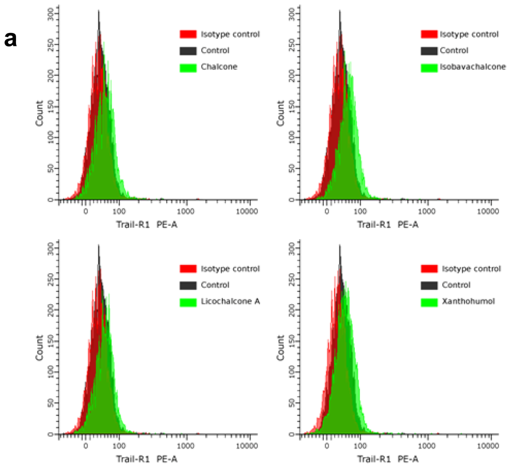 Molecular insights into the regulation of apoptosis and defects in apoptosis signaling will help define the TRAIL-resistance of cancer cells and will provide new approaches for preventive or therapeutic intervention against tumors. TRAIL is one of several members of the TNF superfamily that induce apoptosis through engagement of death receptors [12]. Expression levels of TRAIL-R1/DR4 and/or TRAIL-R2/DR5 on the cancer cell surface may play a critical role in intensity and/or duration of death receptor-mediated signaling in response to death ligands [5,6]. We analyzed the expression of TRAIL-R1 and TRAIL-R2 proteins in HeLa cells after 24-hour treatment with chalcones at the concentration of 25 μM by flow cytometry (Figure 4).
