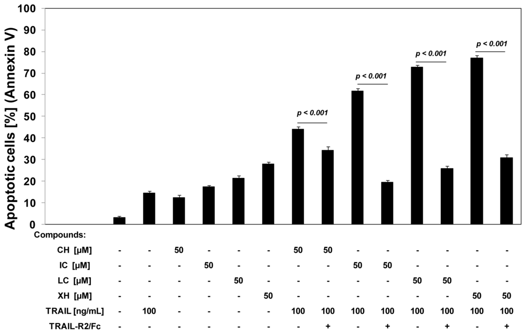 When HeLa cells were treated with the same concentrations of TRAIL and tested compounds, the percentage of apoptotic cells determined by annexin V-FITC staining using flow cytometry was elevated to 32.9% ± 1.1%–44.1% ± 1.3% for chalcone, to 51.5% ± 1.2%–61.7% ± 1.2% for isobavachalcone, to 61.4% ± 1.1%–72.7% ± 1.0% for licochalcone A, and to 62.0% ± 1.2%–77.1% ± 1.2% for xanthohumol.