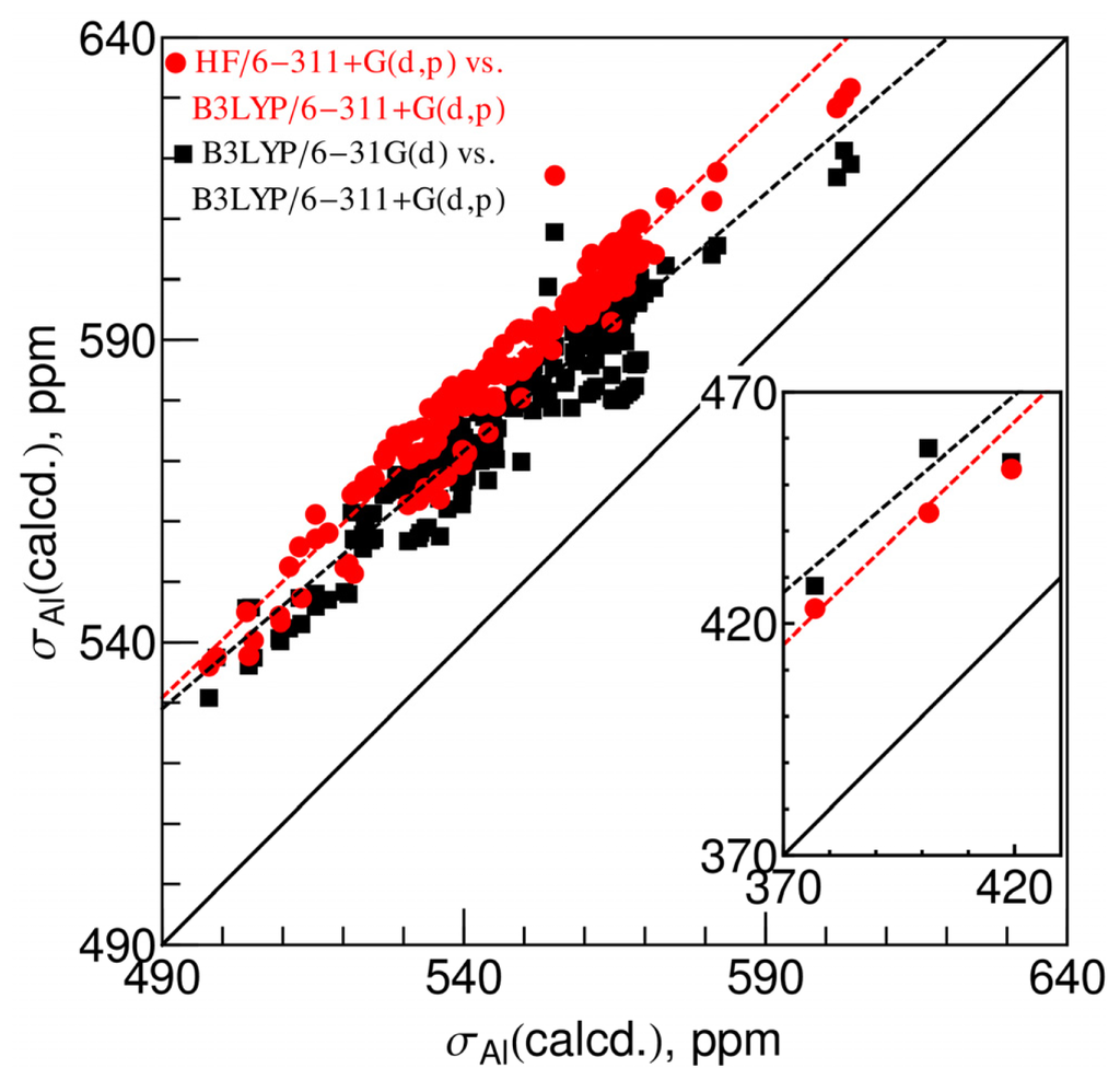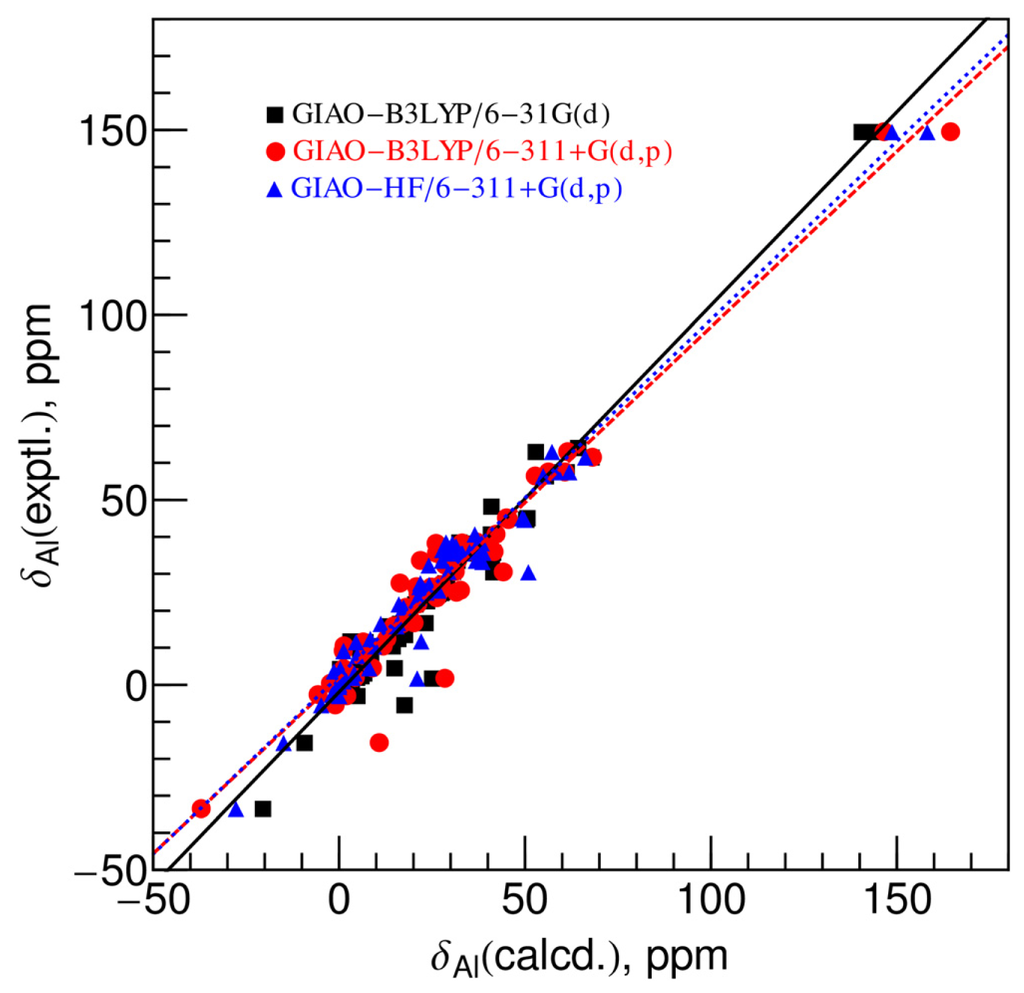 By comparing the results of the three levels of theory, we see that they are similar in terms of the capability in predicting the 27Al chemical shifts, though the GIAO-B3LYP/6-311+G(d,p) model is slightly better than the other two.