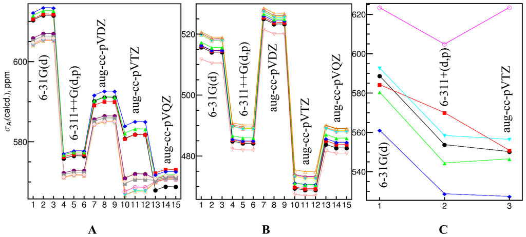 A more comprehensive study including the calculations with Dunning’s correlation consistent basis sets [146,147], aug-cc-pVXZ (X = D, T and Q), was carried out for a limit number of complexes. The calculated shielding constants were shown in Figure 2. It is clear that the values did not converge well even at the aug-cc-pVTZ or aug-cc-pVQZ level for many geometries. However, the shielding constants calculated with different basis sets are highly correlated, which is consistent with the above observation. Jensen [16] proposed to use pcS-n basis sets with DFT methods to obtain the converged shielding constants. Here, we showed that even though there are large errors involved in the absolute shielding constants calculated with the commonly used basis sets, such as 6-31G(d) and 6-311+G(d,p), the errors are not random and a linear relationship exists between the values obtained with these small size basis sets and basis set limits. Therefore, these basis sets are still valuable in predicting 27Al chemical shifts.