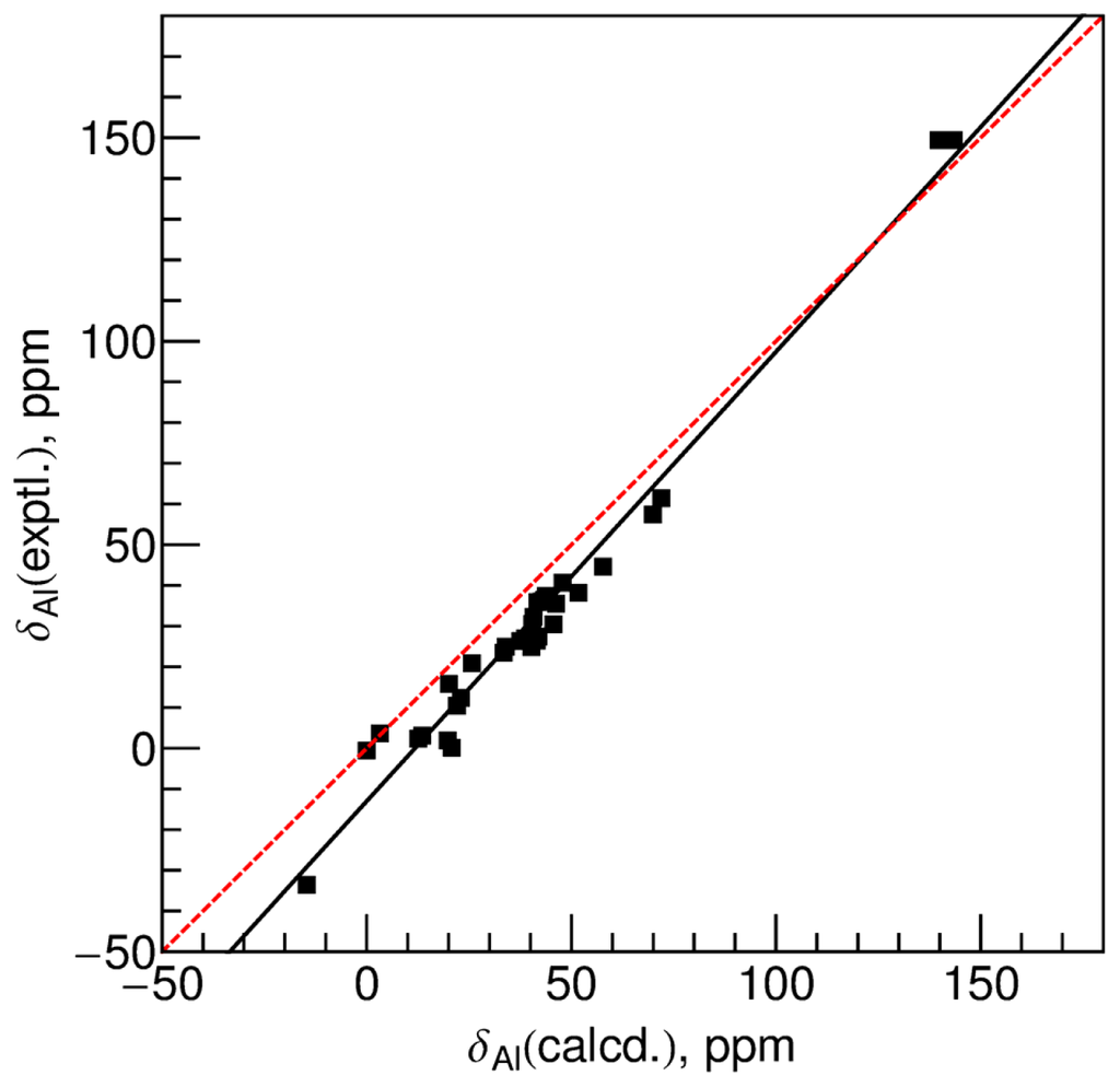 Correlation between the experimental 27Al chemical shifts versus the calculated values at the GIAO-B3LYP/6-31G(d) level using the optimized geometries at the B3LYP/6-31G(d) level. The black solid line is the best-fit linear regression of the data and the best-fit equation is given in Equation 6, while the dashed red line is the ideal diagonal line (y = x).