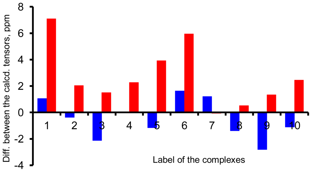 Two more groups of calculations were carried out on 10 representative complexes. In the first group of calculations, the influence of the PCM model to the calculation of the shielding constants was examined using the X-ray geometries at the GIAO-B3LYP/6-31G(d) level. In the second group of calculations, both the geometry optimization and the shielding constants calculation were carried out in the PCM environment of water at the B3LYP/6-31G(d) level. The calculated σAl values were compared with the values obtained in vacuum using the X-ray geometries. The differences are plotted in Figure 5, where the blue and red bars are for the first and second groups of calculations, respectively. Again, we see that the PCM model only causes a minor change to the calculated σAl if the same geometry was used. However, if the geometry optimization was applied, significant changes were observed. This result again says that the geometry parameters of the complexes have a big influence on the calculated σAl.