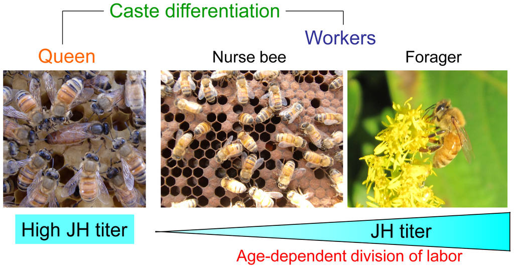 Honeybee society. Female adults are differentiated to reproductive queen and workers in the colony. A single queen lays 1000 eggs every day for reproduction, while the 30,000–50,000 workers are sterile and engage in tasks for colony maintenance. The workers change their tasks in an age-dependent manner (division of labor). Young workers engage in tasks inside the nest (nurse bees), while older workers engage in foraging (forager). Caste differentiation and task changes are regulated by juvenile hormone (JH).