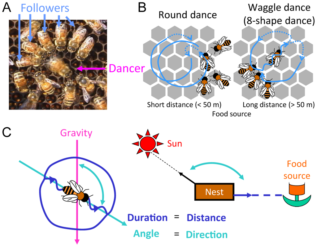Dance communication of the honeybees. (A) A forager that finds a rich food source transmits the location of food source by dance communication (dancer: red arrow). Nestmates (followers: blue arrow) follow the dances several times, decode the dance information, and finally reach the indicated food source; (B) Dancers show different types of dance depending on the distance of the food source from the nest. When a food source is a short distance (<50 m) away, dancers perform round dances. In contrast, when a food source is a long distance (>50 m) away, dancers perform waggle (8-shape) dances; (C) In the waggle dance, foragers indicate the distance and direction to the food source by the duration and angle, respectively, of the waggle-phase of the dance. Foragers see the opposite direction of gravity as the sun direction. Thus, the dance is considered a miniature representation of the foraging trip.