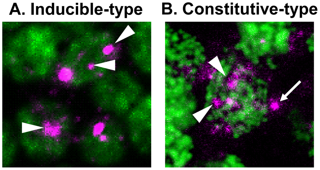 Distinct subcellular localization pattern of kakusei transcripts. (A) Inducible-type kakusei variant, which was initially isolated as a neural activity-induced non-coding RNA, localized exclusively in the nuclei (arrowheads: kakusei is shown in magenta, while nuclear DNA is shown in green); (B) Constitutive-type of kakusei variant, which was identified in a later analysis, localized mainly inside the nuclei (arrowheads) and partially in the periphery of the nuclei (arrow).
