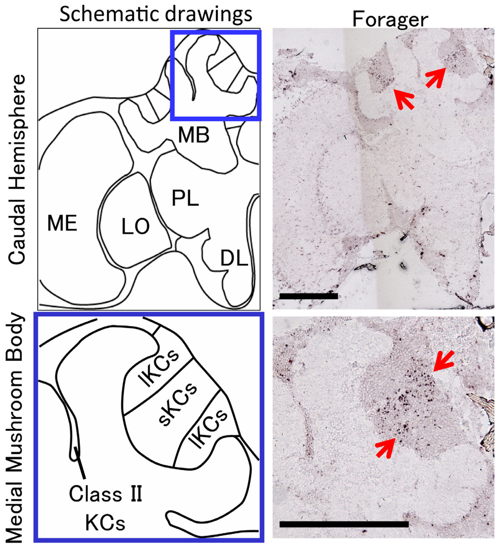 Pattern of kakusei expression in the forager brain. Left panels are schematic drawings of a brain hemisphere (upper panel) and mushroom bodies (lower panel) of the honeybee worker. Right panels are pictures of in situ hybridization of kakusei in the forager brain. As indicated by the red arrows, kakusei was preferentially expressed in the small-type Kenyon cells. Abbreviations: DL, dorsal lobe; MB, mushroom body; ME, medulla; LO, lobula; PL, protocerebrum lobe; lKCs, large-type Kenyon cells; sKCs, small-type Kenyon cells; class II KCs, class II Kenyon cells. Bars indicate 250 μm.