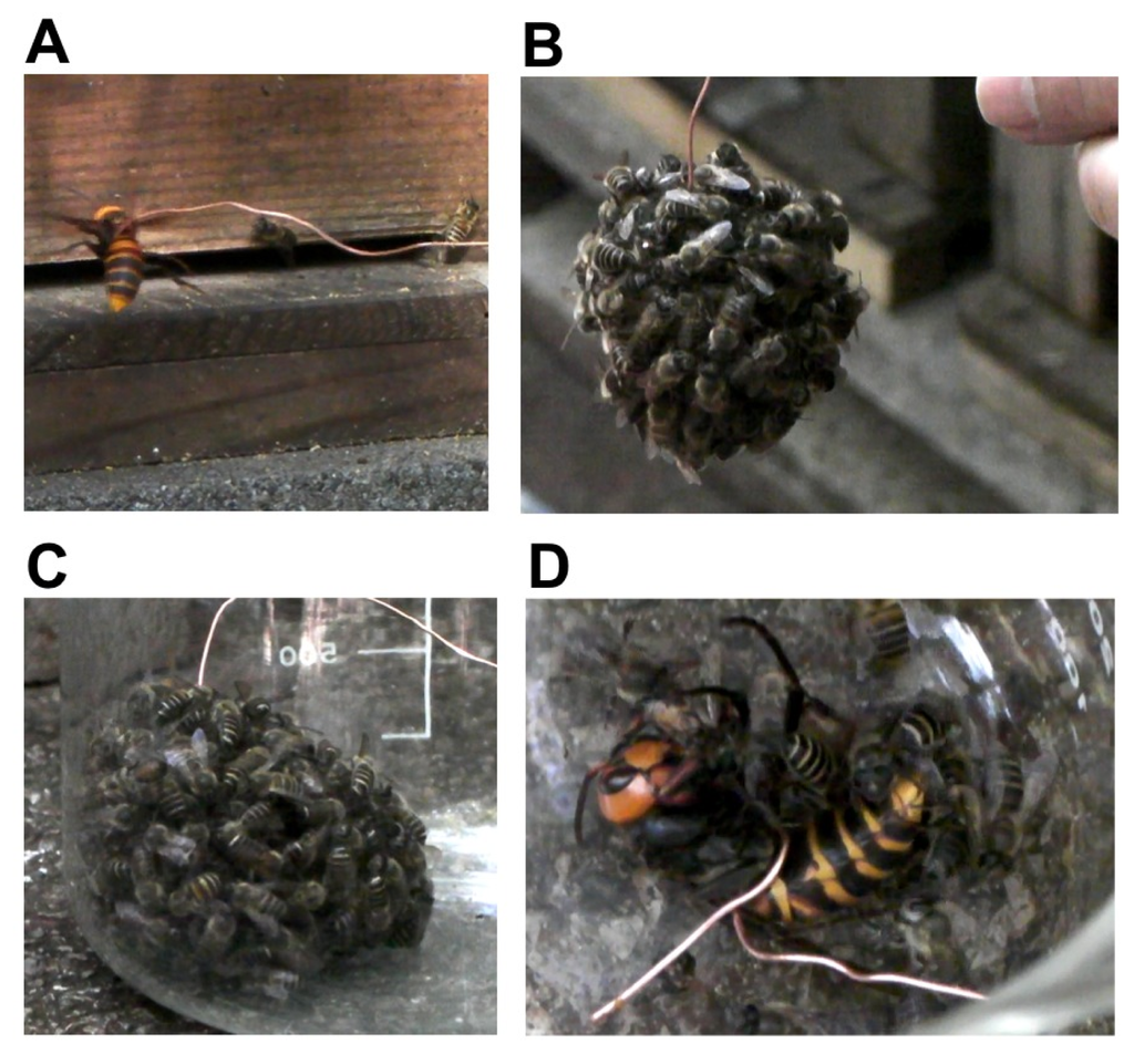 Artificial hot defensive bee ball formation. A hot defensive bee ball is usually formed in the beehive. To collect only the workers involved in forming the bee ball, we attached a giant hornet to the tip of a wire and introduced it into the hive (A) to allow the Japanese honeybees to form a bee ball around the giant hornet (B), and recovered the bee ball in a glass beaker (C). The decoy hornet inside the bee ball was dead 60 min after the formation of the bee ball (D).