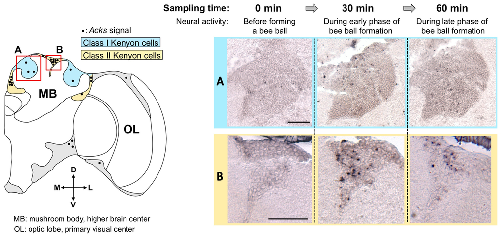 Active brain regions during the formation of a hot defensive bee ball. (Left panel) Schematic drawing of the honeybee brain hemisphere. Acks signals detected in the brains of workers collected 30 and 60 min after bee ball formation are schematically indicated with black dots. (Right panels) The results of in situ hybridization are shown in panels A and B, which correspond to the red boxes in the left panel. Many dotted Acks signals were detected at 30 (middle column) and 60 min (right column) after the bee ball formation. In contrast, minimal signal was detected at 0 min (left column). Note that the Acks signals were much denser in the Class II Kenyon cells (panels B). Bars indicate 100 μm.