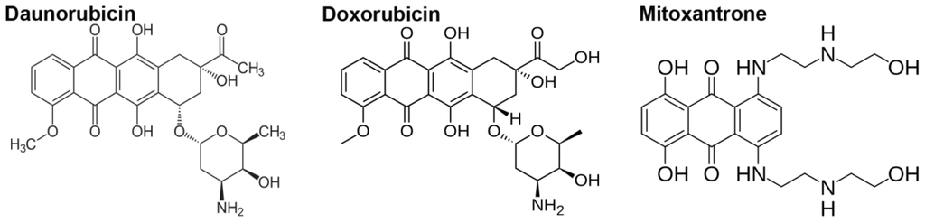 | Daunorubicin | DNR | intercalation, topo II inhibitor | 0.03 | 120 |