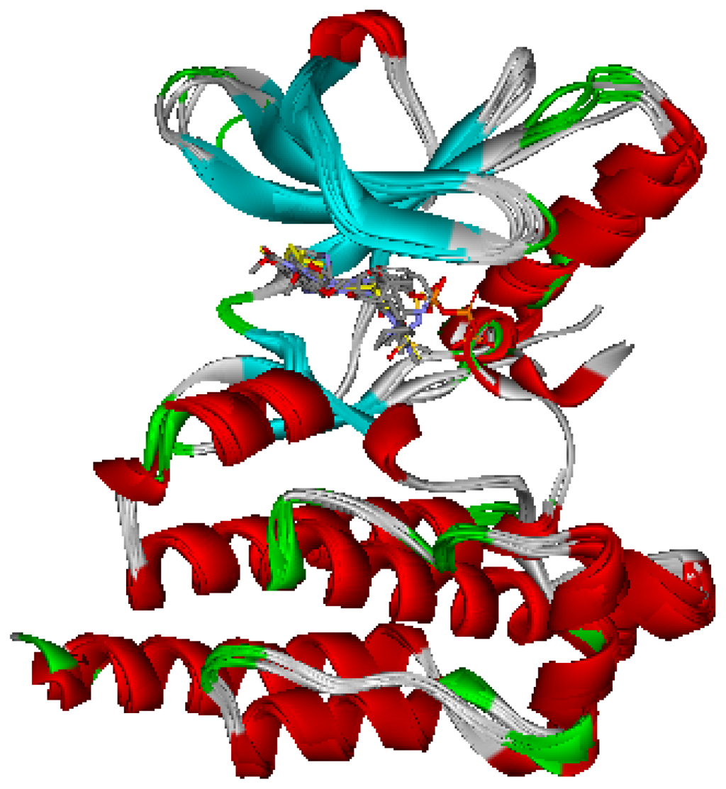 A set of seven crystal structures of FAK in complex with diverse ligands (Table 2) were obtained from the Protein Data Bank (PDB) [23]. Water molecules in ligand-binding sites have been reported to play a crucial role in mediating the interactions between FAK and its ligands, and they can provide useful information for the process of pharmacophore construction [24]. Therefore, all the water molecules in the crystal structures were retained. The coordinates of seven FAK-ligand X-ray crystal structures were transformed into a common reference frame by using “Multiple Structure Alignment (Modeller)” module within the Discovery Studio (DS) [25].
