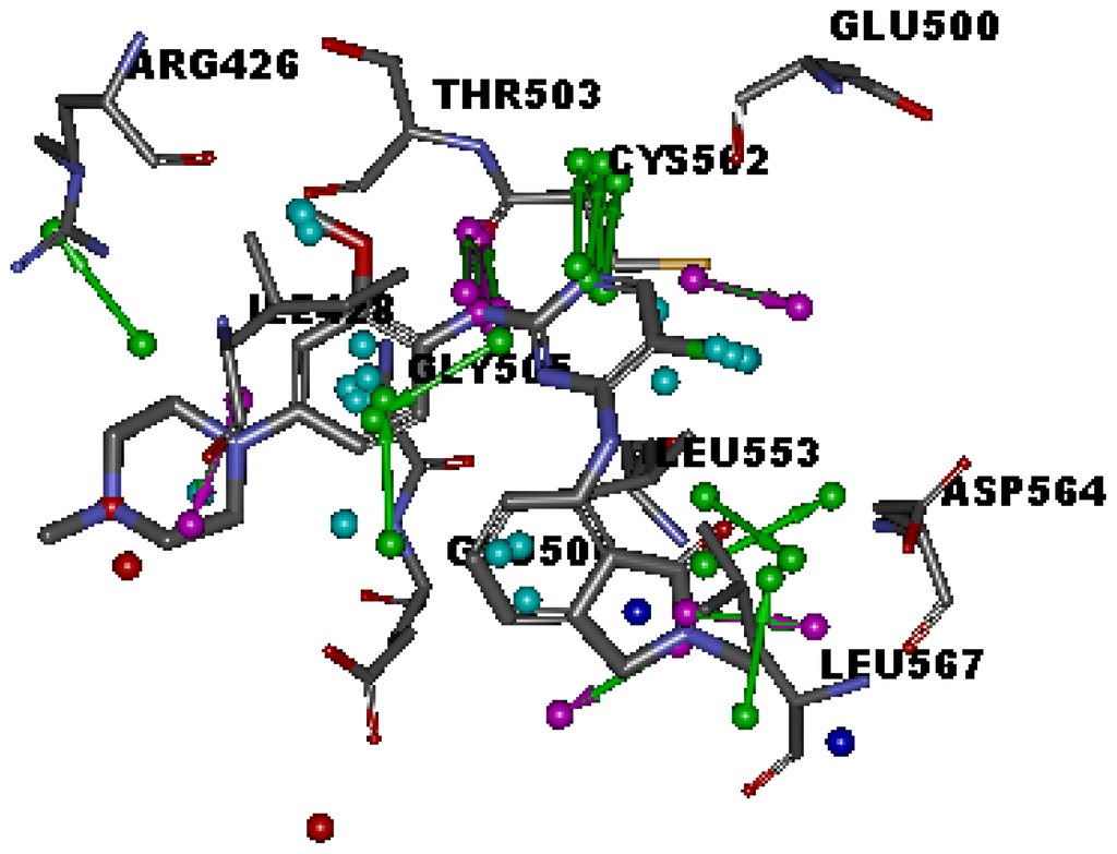 Seven X-ray crystallography structures of FAK in complex with small molecular inhibitors were used to construct pharmacophore. Results of molecular superposition from the result based on Modeller [18] were reported below (Figure 1). The detected pharmacophore features as well as their statistical frequency, which measures how many complexes a given pharmacophore feature can be found in, were showed in Table 1. One can see that there were 15 pharmacophore features, including four hydrogen bond acceptor (A1–A4), four hydrogen bond donors (D1–D4), five hydrophobic features (H1–H5), one positive ionizable point and one negative ionizable point. In the 15 detected pharmacophore features, five features (A1, D1, H1, H2, and H3) were found to common in the seven complexes. It was believed that the pharmacophore features, which present in the complexes with a high probability, were likely to be more important than features exhibiting a low probability. For a full pharmacophore map, it was also important to include excluded volume features, which reflected potential steric restriction and corresponded to the positions that were inaccessible to any potential ligand. A comprehensive pharmacophore map and the ligand binding conformarion at the ATP site of FAK had been shown in Figure 2. The comprehensive pharmacophore map obtained initially was too restrictive and not suitable for the virtual screening since it contained a large number of chemical features and the fit of a molecule to such a pharmacophore was still out of reach for today’s state-of-the-art computational tools [19]. A correctly reduced pharmacophore model would be much more preferred in terms of practical application [20–22]. According to our experience, the top-ranked five features (A1, D1, H1, H2, and H3), would be more appropriate in practice, and consequently, they were selected from the comprehensive pharmacophore map and were merged to generate a multicomplex-based phamacophore (Figure 3). The difference of the chemical feature in this position between the ligand-based pharmacophore model and multicomplex-based pharmacophore was mainly due to the distinct methodologies that have been employed.