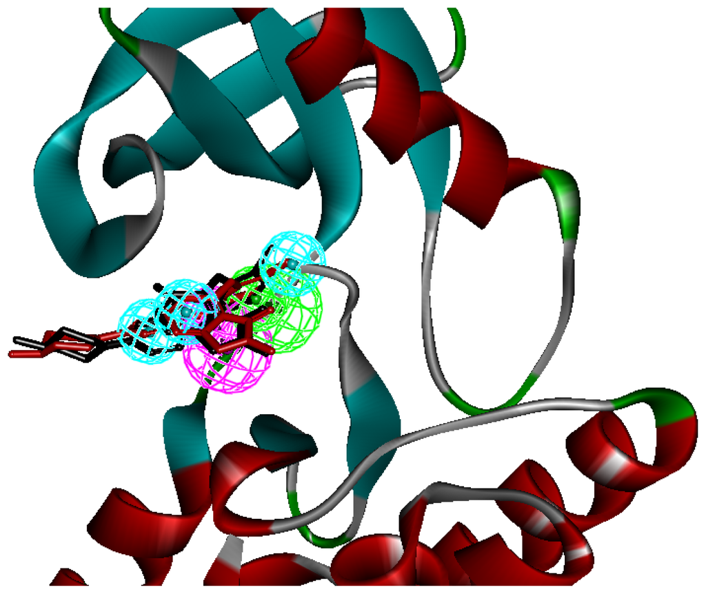 A reliable pharmacophore model may be used to determine the bioactive conformations of the ligands that share the same binding mode. The conformation selected for each compound, assumed as the bioactive conformation, corresponds to the conformation which best fits the pharmacophore. To verify whether the pharmacophore model finds the correct bioactive conformation, we applied the method to inhibitor TAF089, whose bioactive conformation is known from the co-crystal structure of FAK and the binding mode that is similar to the other derivatives. Thus, the X-ray crystal structure of FAK kinase (PDB code: 2JKO) was selected from the Protein Data Bank. The bound conformation of this inhibitor was respectively mapped onto the pharmacophore model using the flexible fitting method and the best mapping only option in the Ligand Pharmacophore Mapping protocol and meanwhile superimposed to the best mapping conformations (Figure 3). The RMSD value between the heavy atom positions of the bound and the best mapping conformation was 0.52 Å. The result showed that the pharmacophore model is capable of reproducing the bioactive conformation from the Protein Data Bank and support our choice for the bioactive conformation obtained from the best mapping conformation.