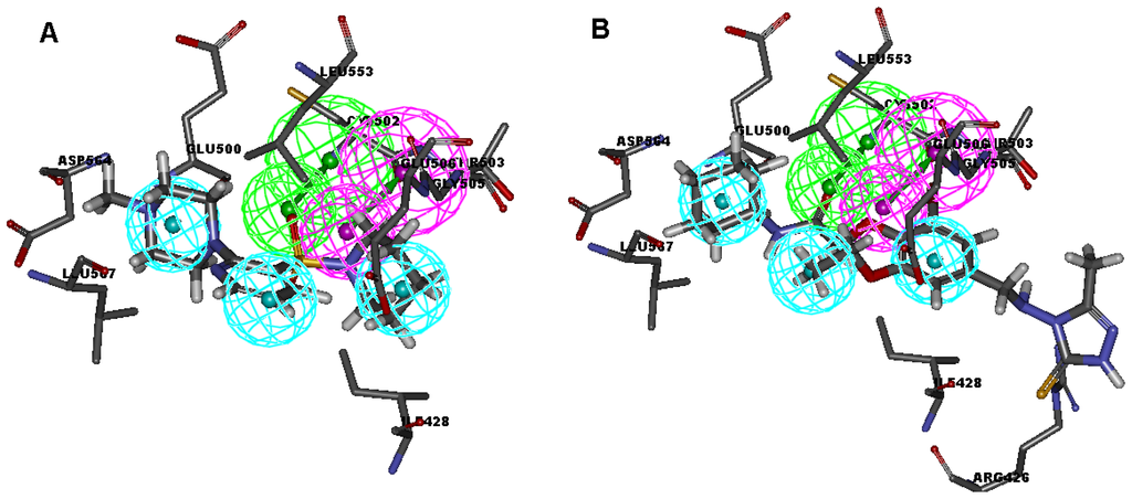 Among these hits, compounds ZINC19815502 and ZINC00679655, which are different in their chemical scaffolds, were identified as promising novel leads against FAK with high estimated IC50 value of 0.058 μM and 0.173 μM, respectively. They mapped all the features of multicomplex-based pharmacophore by choosing the best/flexible searching option (Figure 4), and the docked conformations with key residues in the active site of FAK (Figure 4). As they also satisfied all the drug-like properties, the two lead compounds would be focalized for further refining and optimizing to discover novel inhibitors with potent activity against FAK.