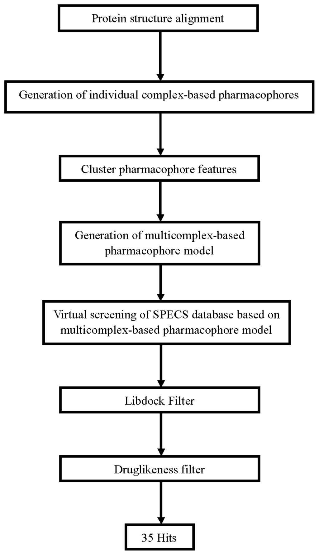 The whole process of generation and utilization of the multicomplex-based pharmacophore models were illustrated in Figure 5 and detailed as follows. The complex-based pharmacophore generation module in DS was used to generate seven individual complex-based pharmacophore models based on the previously aligned structures. For the purposes of creating a multicomplex-based pharmacophore model, all the pharmacophore features identified by DS were clustered according to their interaction pattern with the receptor. The cluster centers were identified using the Discovery Studio [25]. The model obtained was further refined by the modification of the constraint tolerance of the spheres in accordance with the default values of Catalyst modules in Discovery Studio.