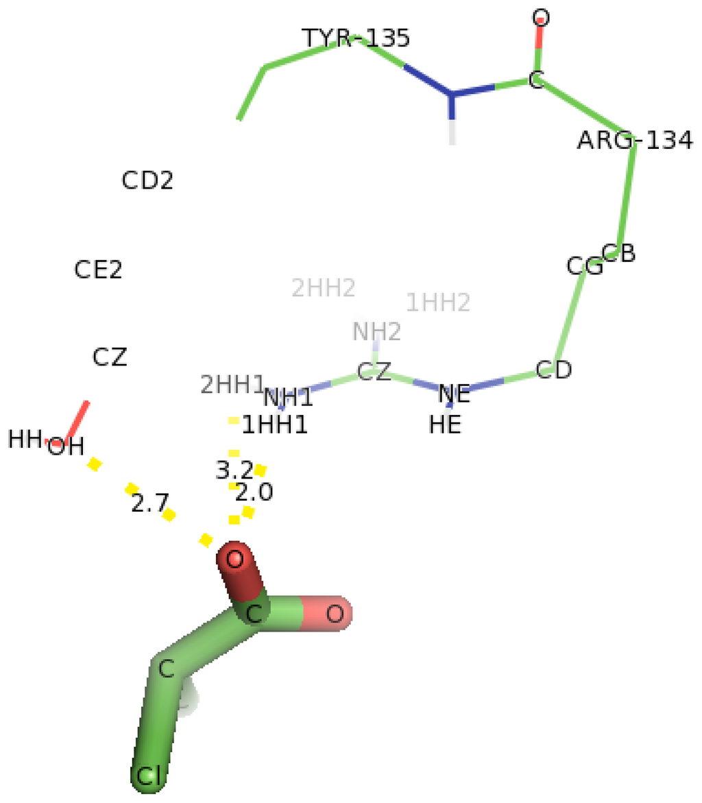 In the case of Y135A variant (Figure 15), docking of D-2CP into it showed that Arg231 and Gln221 were found to interact with D-2CP. The first hydrogen atom (2HH1) of Arg231 bonded to the oxygen atom of the hydroxyl group of D-2CP at a distance of 1.9 Å, and the second hydrogen atom (2HH2) bonded to the oxygen of the carbonyl carbon in D-2CP at a distance of 2.0 Å. The second hydrogen atom (2HE2) of Gln221 bonded to the oxygen atom of the carbonyl carbon in D-2CP at a distance of 2.0 Å, both of which are within the hydrogen bonding distance [45]. Thr124, His127 and Leu128 were observed as close contacts, possibly stabilizing helix 6.