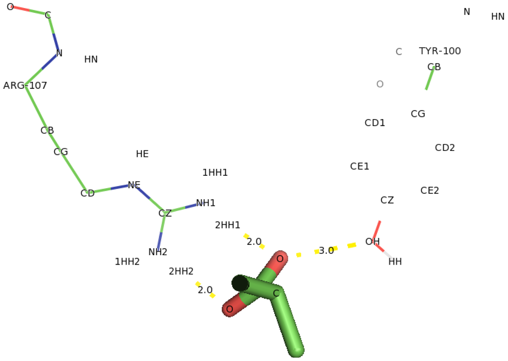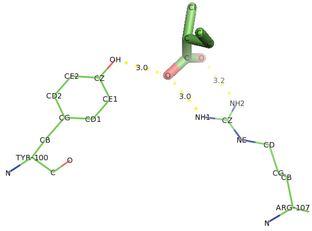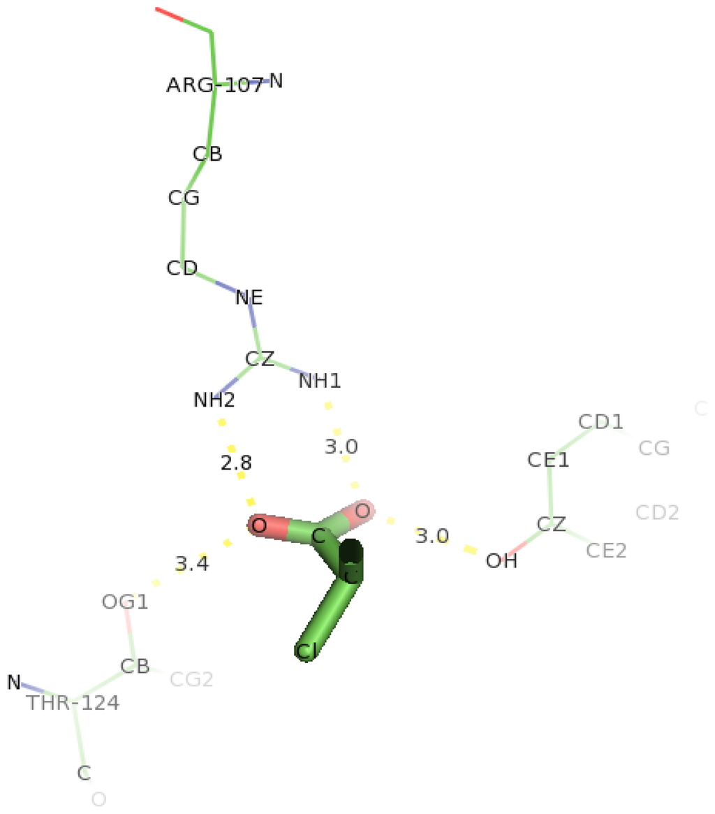In docking studies involving D,L-2,3-DCP into DehD (Figure 20), two amino acid residues (Arg107 and Thr121 were observed to interact with D,L-2,3-DCP. Although DehD was reported to act on D,L-2,3-DCP with a higher activity (km = 0.38 mM) compared to that of D-2CP (km = 0.06 mM) [29]. NH1 atom of Arg107 interacted oxygen of the carboxylate group of D,L-2,3-DCP at a distance of 3.0 Å and its NH2 hydrogen atom bonded to oxygen of the carbonyl group of DehD at a distance of 3.2 Å. Hydroxyl group of Tyr100 bonded to carboxylate oxygen at a distance of 3.0 Å. Arg121 were observed as near residues. These hydrogen bond distances are long for the protein to act on D,L-2,3-DCP. Involvement of Arg107 in processing D,L-2,3-DCP calls for experimental investigation.
