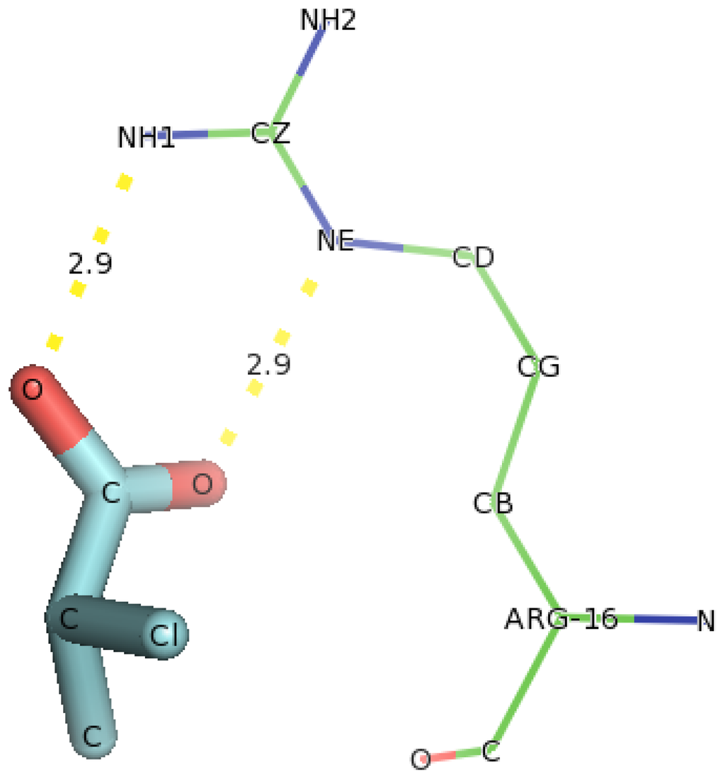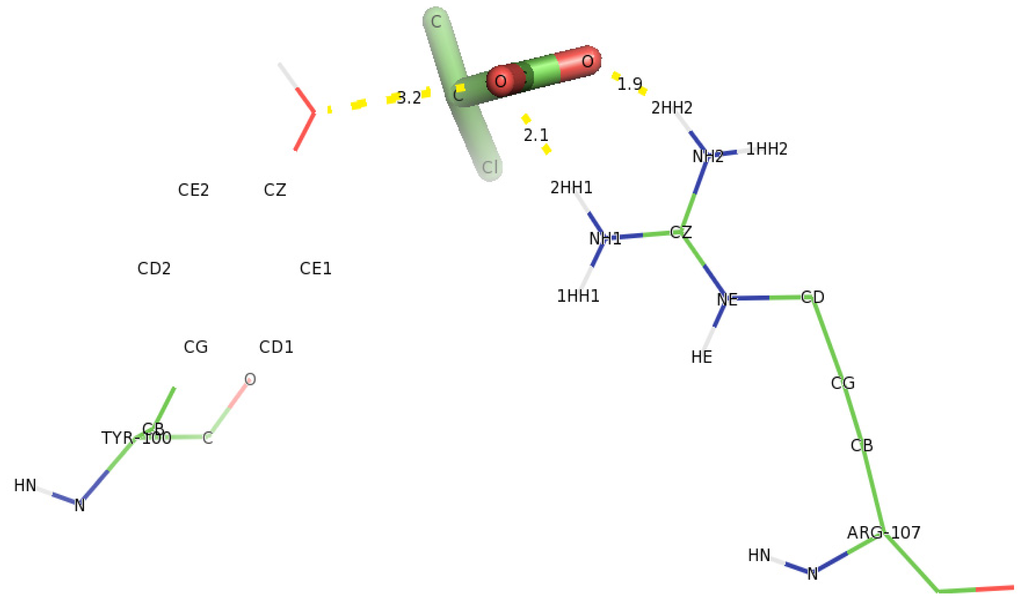 Similar, docking of D-2CP into Y107A variant (Figure 16) showed only Arg16 was in hydrogen bonding with D-2CP. NE atom of Arg107 bonded to carbonyl oxygen of D-2CP and NH1 atom bonded to oxygen of carboxylate group of D-2CP both at distances of 2.9 Å. This hydrogen bond distance is also weak and no close residue to help in catalysis of D-2CP.