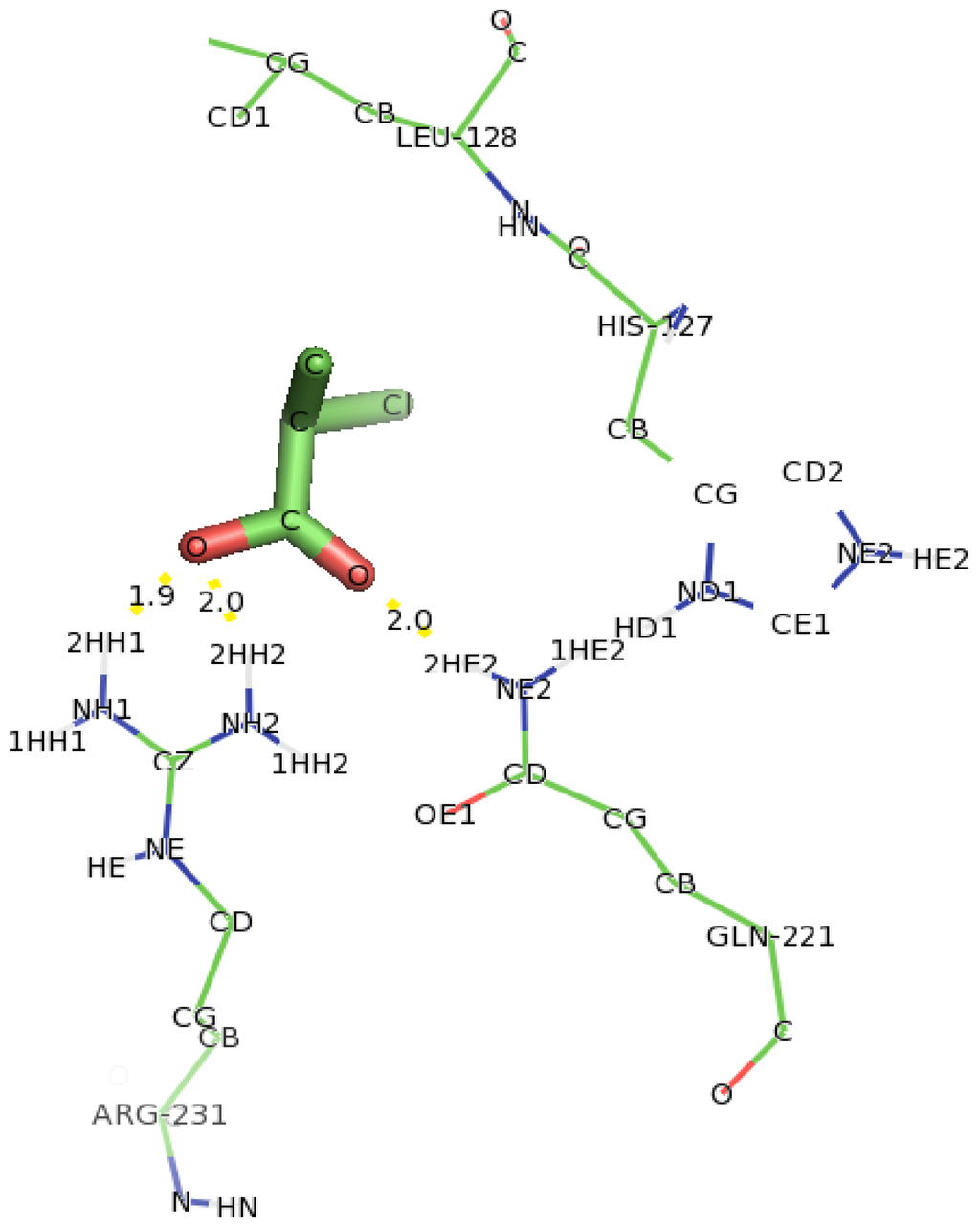 Docking of 2,2-DCP into the active site of DehD (Figure 21) also showed interaction with the residues not earlier predicted in the protein binding site. Gln221 was observed in hydrogen bonding through its NE2 atom with oxygen atom of the carbonyl group of 2,2-DCP at a distance of 2.8 Å. Arg231 bonded to oxygen atom of the carbonyl group of 2,2-DCP through its NH2 atom at a distance of 3.0 Å and also bonded to oxygen atom of the carboxylate group of 2,2-DCP at a distance of 2.8 Å. His127, Thr124, Leu129 and Thr131 were observed as close contacts. This hydrogen bond distance is also not favorable for dehalogenation process to occur. This is in line with the experimental findings that DehD does not act on 2,2-DCP [29].