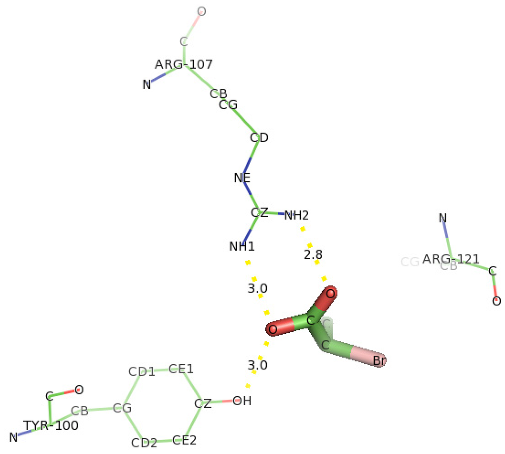 Docking of D-2-bromopropionate (D-2BP) into DehD (Figure 18) showed that Arg107 was found to interact with DehD through two hydrogen bondings. One hydrogen bonding was at NH1 atom of Arg107 and oxygen of carboxylate group of D-2BP at a distance of 3.0 Å and the other one hydrogen bonded at NH2 atom of Arg107 and oxygen of the carbonyl group of D-2BP at a distance 2.8 Å.