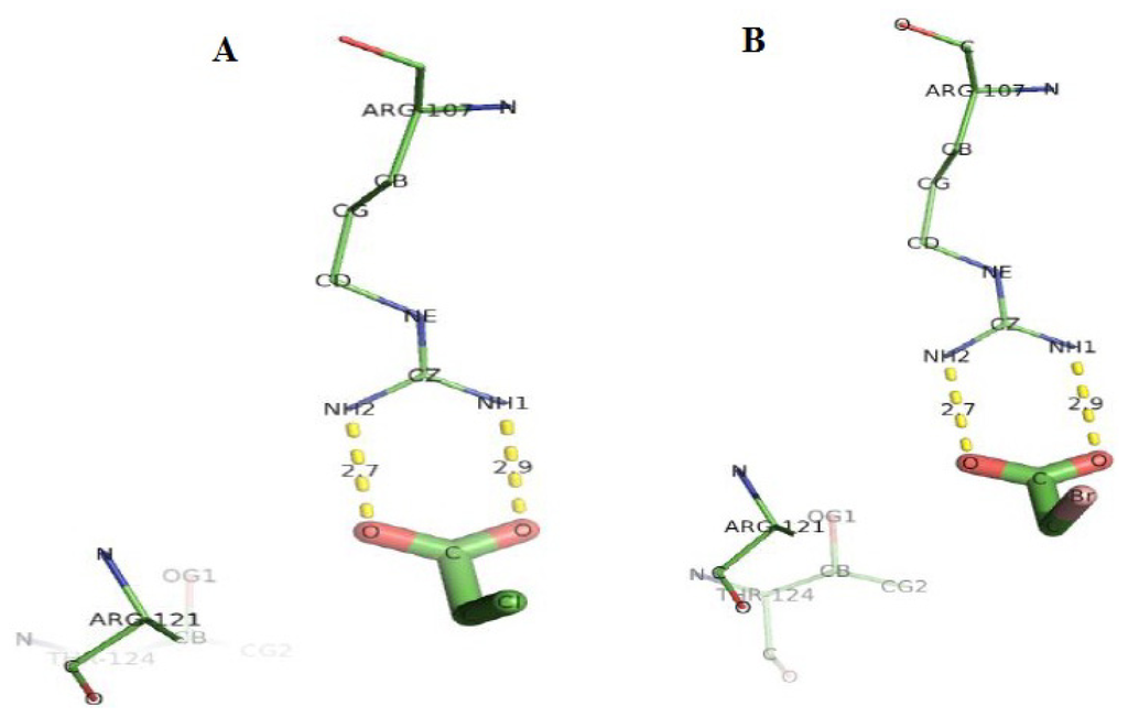 Docking of monochloroacetate (MCA) and monobromoacetate (MBA) (Figure 19) both showed Arg107 bonding with these substrates at same distances and atoms. The hydrogen bonding between both substrates and DehD were at a distance 2.9 Å from NH1 atom of Arg107 to the oxygen of the substrate and at a distance 2.7 Å from NH2 atom of Arg107 to the oxygen of the substrates. The interactions between DehD and other substrates (D-2BP, MCA and MBA) are not within the proposed hydrogen bond distances. This observation is in line with the experimental high kinetic activity (km) values for these substrates compared to D-2CP as earlier reported [29].