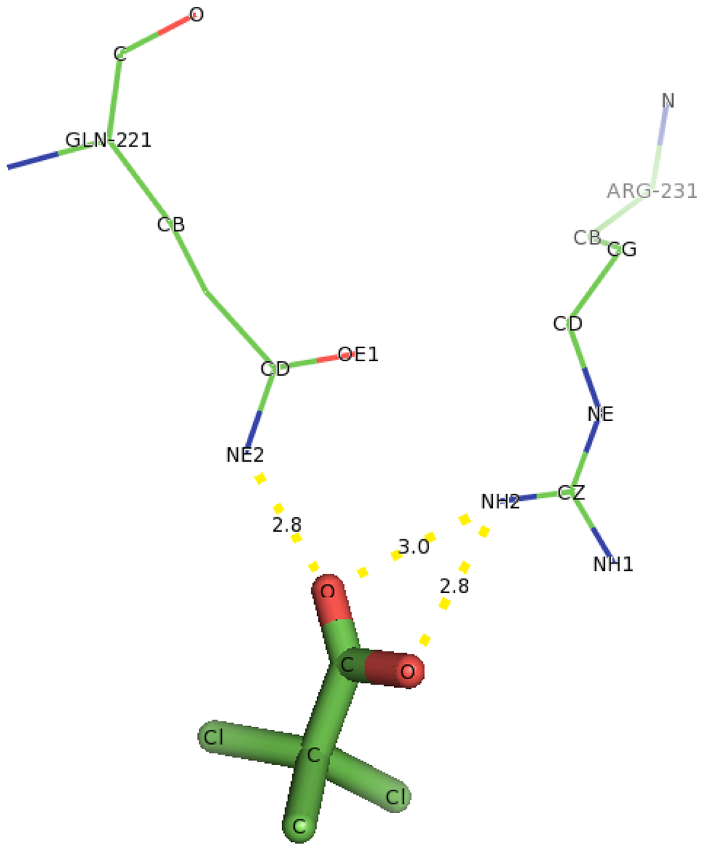 The interacting residues of DehD with 2,2-DCP. Hydrogen bond distances are in Å.