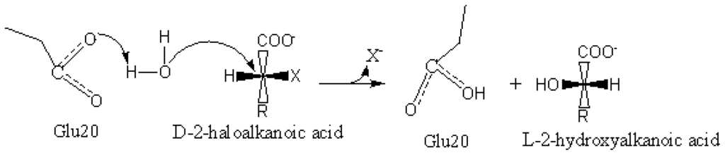 - Li, Y.-F.; Hata, Y.; Fujii, T.; Hisano, T.; Nishihara, M.; Kurihara, T.; Esaki, N. Crystal structures of reaction intermediates of L-2-haloacid dehalogenase and implications for the reaction mechanism. J. Biol. Chem 1998, 273, 15035–15044. [Google Scholar]