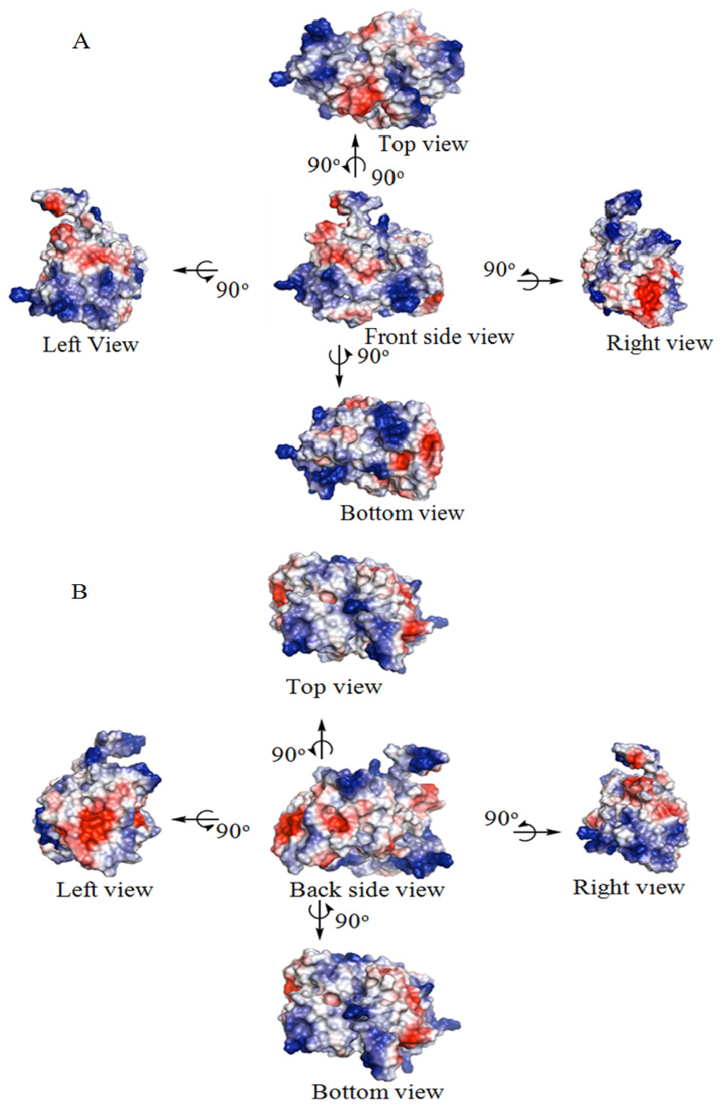DehD Structure showing the accessible surface colored according to electrostatic potential (ESP). (A) Shows graphical rotation of front side view of the accessible surface. (B) Shows graphical rotation of back side view of the accessible surface.