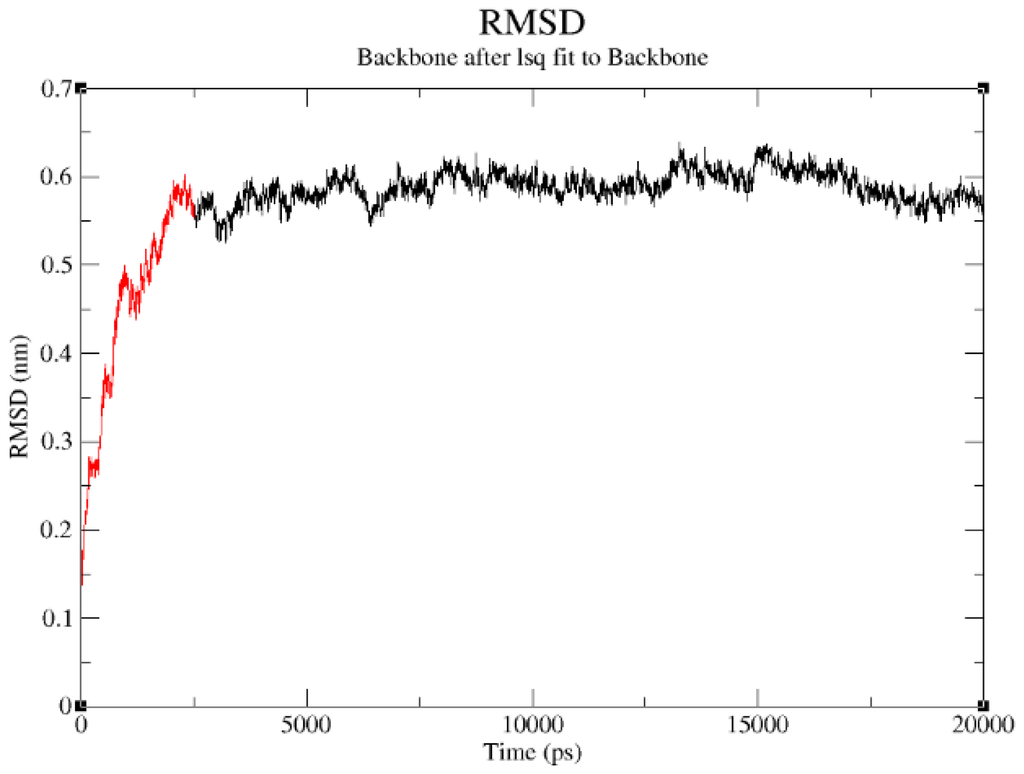 RMSD of DehD stable conformation observed after the extension of a simulation run from 5000 ps to 20,000 ps. Extension from 5000 ps to 20,000 ps shown in black color.