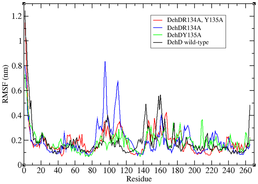For the validation of structural model after MD simulation, Ramachandran plot [40] (Figure 8B) showed that the phi/psi angles of 79.6% are in the most favored regions only, 16.1% in additional allowed regions, 2.2% in generously allowed regions, and 2.2% amino acid residues (Arg154, Asp163, Ser192, Glu216 and Gln221) were in disallowed regions. The average G-factors were –0.65 phi/psi, −0.68 chi1–chi2 plots, −0.19 chi1 plots only, 0.49 chi3 and chi4 plots, −1.08 omega deviation, −0.63 dihedrals, 0.47 main chain bonds, −2.45 main chain angles and −0.78 overall G-factors. The bandwidths quality of the model slightly deviated from the mean, resulting in a quality of 79.6% at a stable conformation after 20 ns simulation when compared to the crystal structure of DehI from Pseudomonas putida strain PP3 [13]. The structural model had only 2.2% of its residues in the disallowed region and the worst position of the Omega angle standard deviation from the mean bandwidth was only 3°. All other parameters were more accurate and were found within the plot. The structural model here produced is, therefore, a presumably good model of DehD. However, crystallization of DehD is recommended to further confirm the validity of the present model. The low value of 79.6% model quality might be attributed to the fact that DehD also has very low similarity to any of the crystal structures in the protein database (PDB), and the modeling server utilized the only available template with reasonable resemblance. When the active site of DehD was superimposed on that of the template protein employed by I-TASSER Server that was used by modeling server for comparison, it was found that the two proteins had dissimilar active sites and may not have the same catalytic residues. When the model was further reevaluated using molecular dynamics simulation, it produced equilibrium geometry that indicated a quality model for DehD. When run at a constant total energy of the system of −7.2 × 105 kJ/mol and RMSD of 0.60 nm, the simulation showed that the RMSF of the DehD amino acids generally gave a best-fit conformation approximately 0.18 nm. R134A and Y135A were found to fit at 0.2 nm, and their corresponding double substitution mutant R134A/Y135A was found to fit at 0.4 nm. This observation indicates that the force field used in the simulation adequately sampled the folded state at a lower free energy basin for wild-type DehD than for its variants.