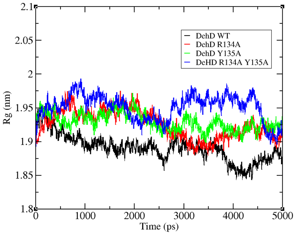 The R134 and Y135 residues were found fit at 0.2 nm gyration and their corresponding mutants R134A and Y135A were found fit at 0.4 nm (Figure 6). All the residues in the tested proteins fluctuate averagely around or near wild-type values (approximately 0.2 nm). However, residues 95 and 104 in the variant R134A fluctuate at 0.88 nm and 0.68 nm, respectively, higher than for any other residue. Additionally, wild-type DehD and its variants amino acid residues were observed to fold and collapse initially within an average distance of 1.90–1.95 nm (Figure 7), with an increase in gyration over time for the variants and a decrease for the wild type. At 2600 ps, the gyration of wild-type DehD dropped to 1.85 nm and that of its variants amino acid residues dropped to 1.92 nm. DehD carrying the double substitution mutation (R134A and Y135A) unfolded and collapsed at longest gyration distance of 1.98 nm about its x, y and z-axes before attaining a stable conformation. All DehD variants stabilize at a gyration distance of about 1.92 nm at 2800–3000 ps.