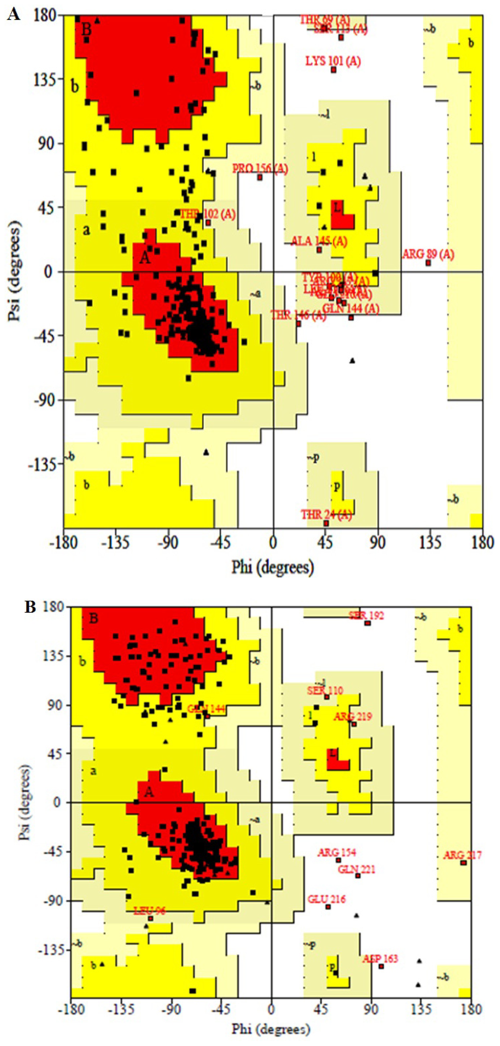 Ramachandran plot of the 3D structure of DehD evaluated by the PROCHECK program. (A) Model before refinement. (B) Model after MD simulation. The most favored and favored region are indicated with red and yellow colors, respectively. The generously allowed region is shown in pale yellow and the disallowed region is in white color.
