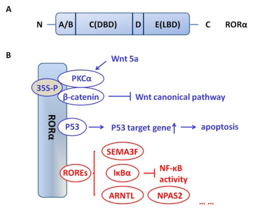 Schematic structure of RORα and interaction of RORα with other proteins andpathways. (A) RORα shows a typical domain structure with four major functional domains. The A/B region refers to amino-terminal of RORα. The C region, highly conserved among the ROR family members, is the DNA binding domain (DBD). D is the hinge domain and links the C region to the E region. The E region is the ligand binding domain (LBD); (B) Canonical (red) and non-canonical (blue) nuclear receptor activities that may contribute to tumor suppressor function of RORα.