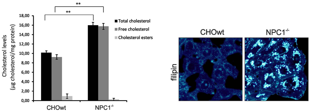 2.1. CHO-NPC1−/− Cells are Enriched in Total, as well as, Vesicular Cholesterol
