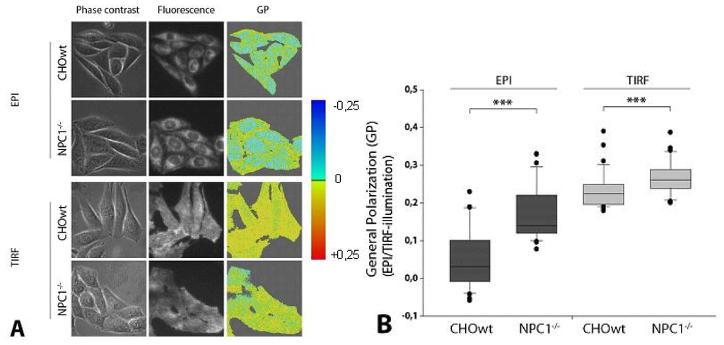 2.2. NPC1−/− Cells Display Higher Membrane Stiffness at Intracellular Membranes