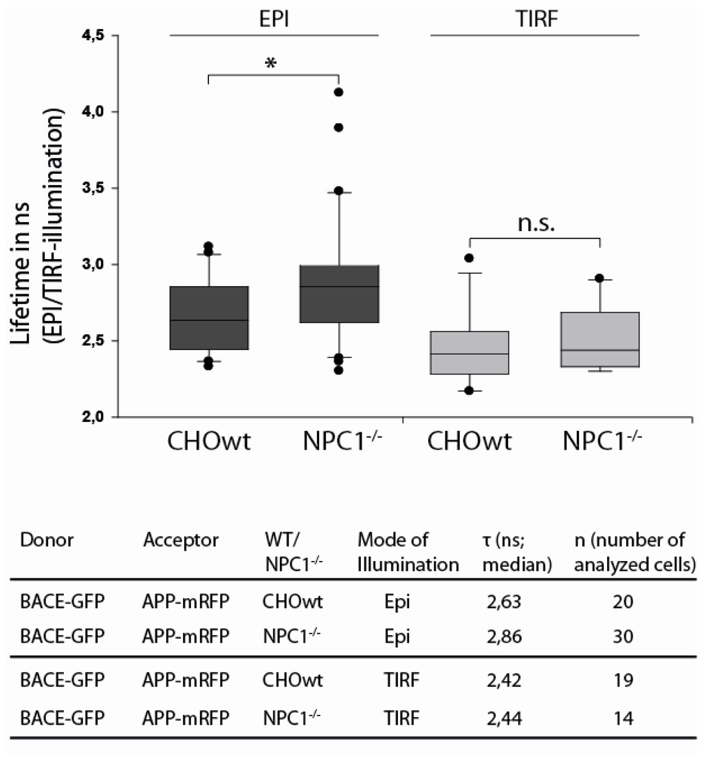 Von Einem B, Weber P, Wagner M, Malnar M, Kosicek M, Hecimovic S, VonArnim CAF, Schneckenburger H. Cholesterol-Dependent Energy Transfer between Fluorescent Proteins—Insights into Protein Proximity of APP and BACE1 in Different Membranes in Niemann-Pick Type C Disease Cells. International Journal of Molecular Sciences. 2012; 13(12):15801-15812. https://doi.org/10.3390/ijms131215801