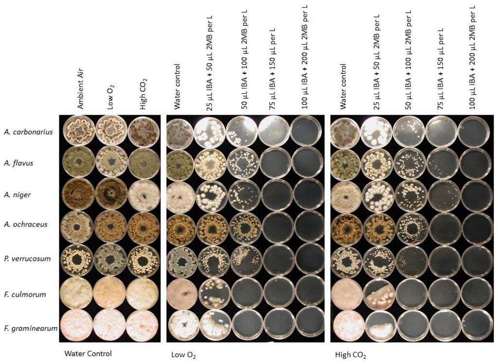 Conidial germination and fungal growth of mycotoxin-producing Aspergillus, Penicillium and Fusarium species on potato dextrose agar exposed to low oxygen (1% O2 and 0.03% CO2) or high CO2 (20.8% O2 and 15% CO2) atmospheres at 3 °C for 72 h in the presence of four concentrations of isobutyric acid (IBA) and 2-methyl-1-butanol (2MB)(25 + 50, 50 + 100, 75 + 150 or 100 + 200 μL/L of container headspace). The treated cultures were incubated in ambient air at room temperature for seven days after treatment and then photographed.