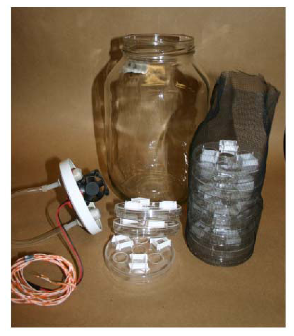 Four liter jar, lid with fan and nylon mesh sleeve with Petri dishes and perforated lids with spacers used to incubate PDA plates of fungal conidia with M. albus volatiles.